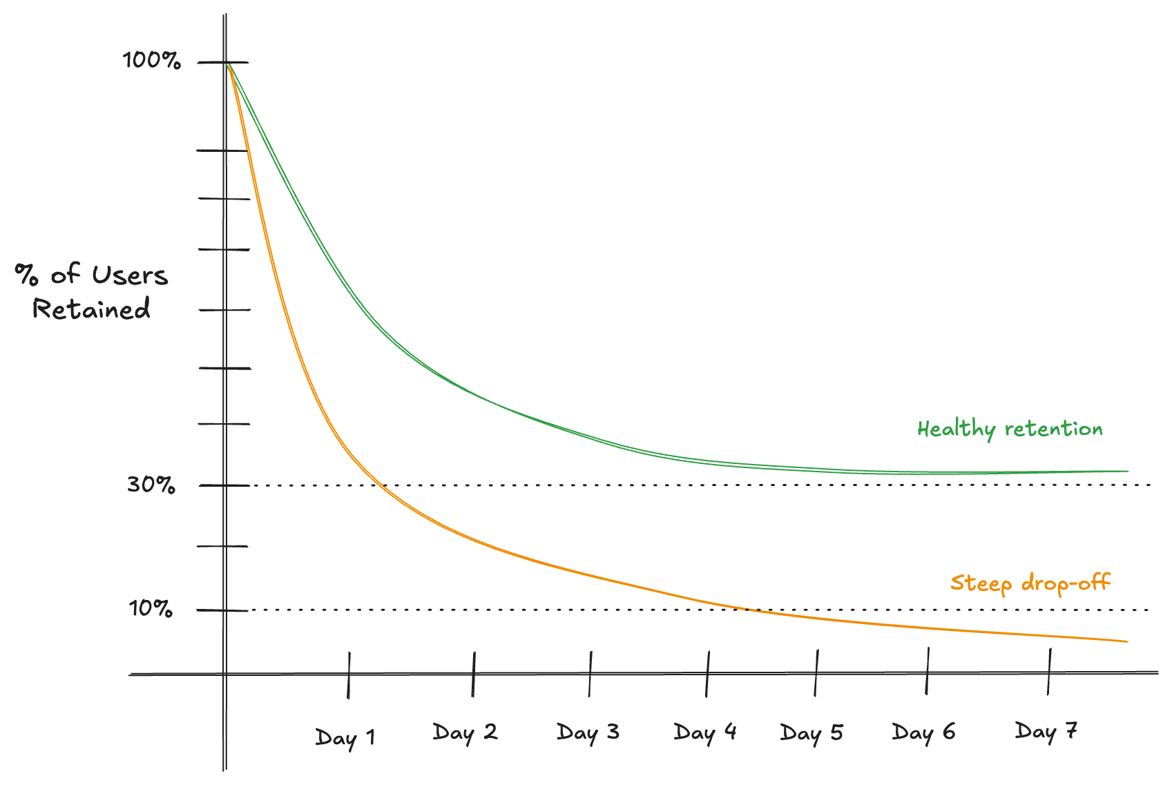 Retention is often visualized as a curve over time tracking the percentage of users who return after their first visit.